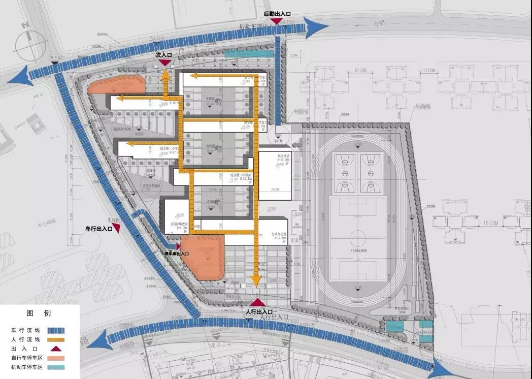 校園內采用人車分流設計,學校的車行出入口,圍繞教學、運動場外圍形成4m寬的車行環道,解決學校老師車輛出入、家長接送、后勤服務、消防等情況時車輛的通行,確保師生平安出入。