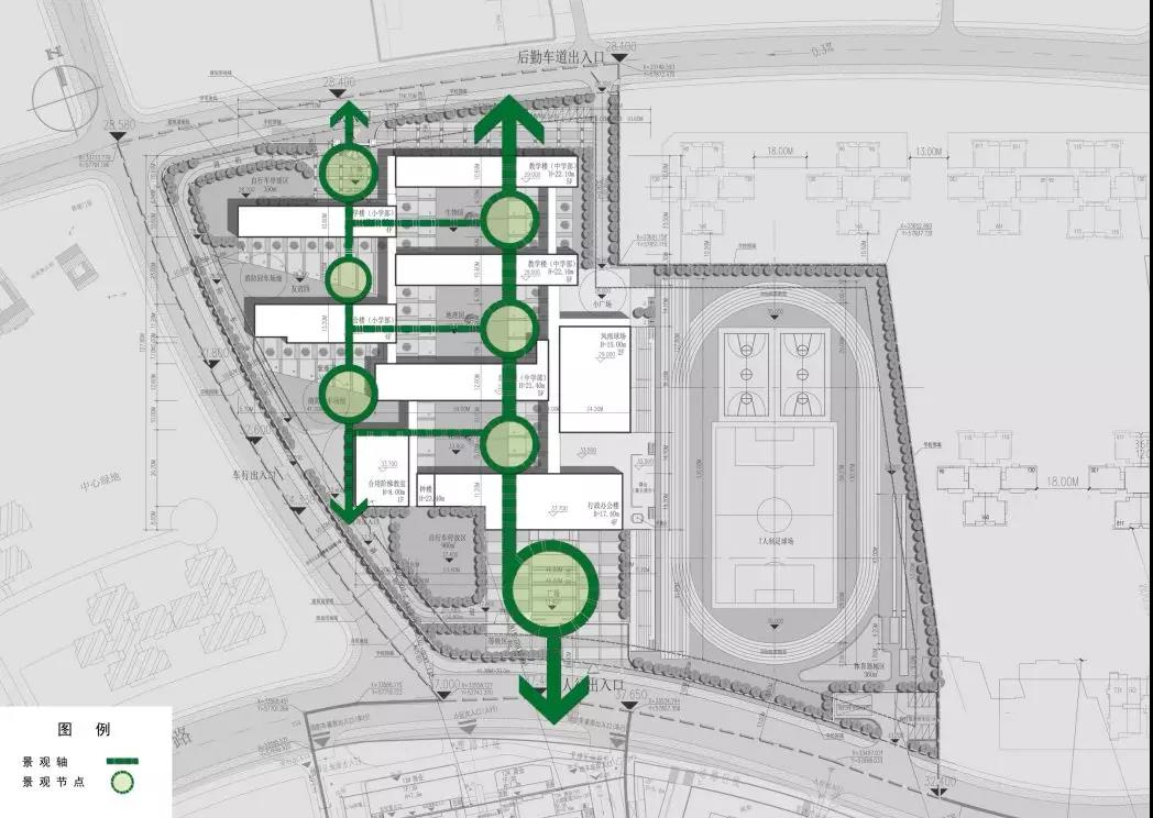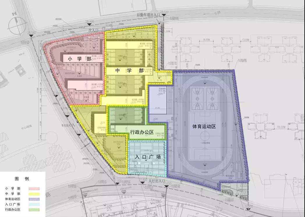 學校北面是小學入口廣場,南面是中學入口廣場,由南到北功能分區合理規劃,布置了行政區、教學區、東面是風雨操場和運動場。