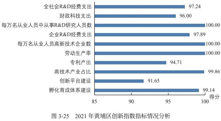 從黃埔區創新指數指標情況分析可以看到,企業創新和創新績效表現突出,每萬名從業人員高新技術企業數得分為100分,高技術產業占比得分為99.86分,指標得分排名均居全市第一