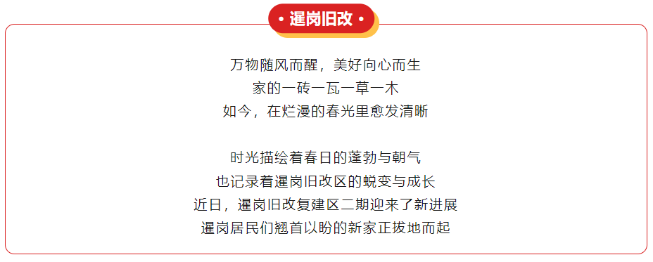 接下來,暹崗舊改項目繼續全力推進復建房建設工作,復建區二期進度也快馬加鞭建設中,讓居民再次喜迎新居!